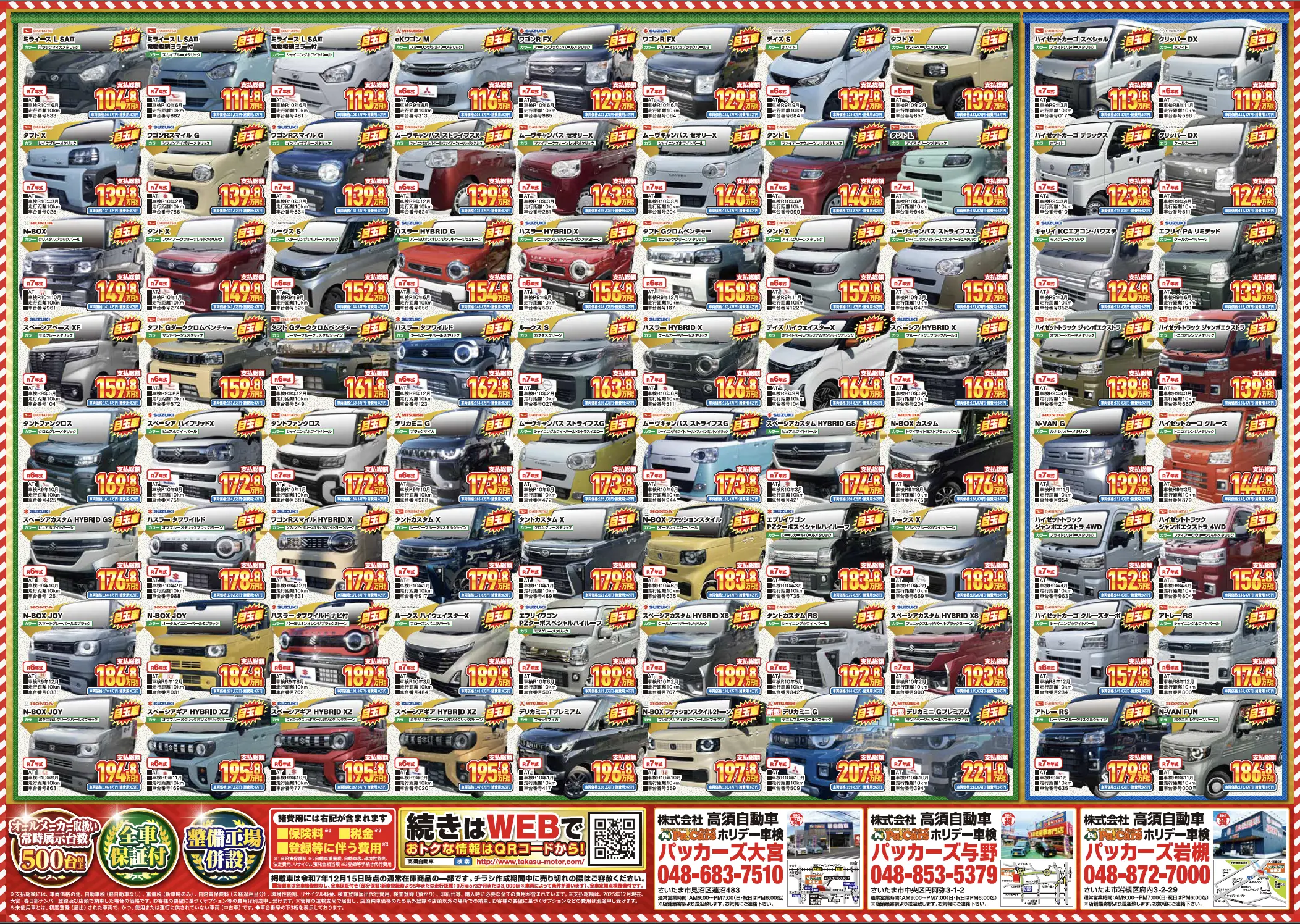 未使用車・中古車・新車の販売や車検のことなら、埼玉県さいたま市内を中心に9店舗。真心で安心と安全をお届けする「高須自動車」をご利用ください。目指せ!地域最安値!!満足のいくクルマをナットク価格&安心サービスで。車の販売はもちろん、買取も行っております。車検・自動車修理・保険業務など皆様の快適なマイカーライフをお手伝い。常に新しいことにチャレンジし、お客様第一主義を基本理念とし、これからもこの理念を忠実にビジネス展開してゆく事が、お客様方に深いご理解とご賛同をいただけると確信しております。皆様に愛され、親しまれ、信頼されて、地域でNo1となるために、全てのお客様に喜びとご満足をご提供できるようにと日々努力してまいります。未使用車を中心にワゴンR・アルトラパン・kei・エブリィバン・エブリィワゴン・スイフト・ekワゴン・ムーヴ・タントなど人気の車が勢ぞろい!!