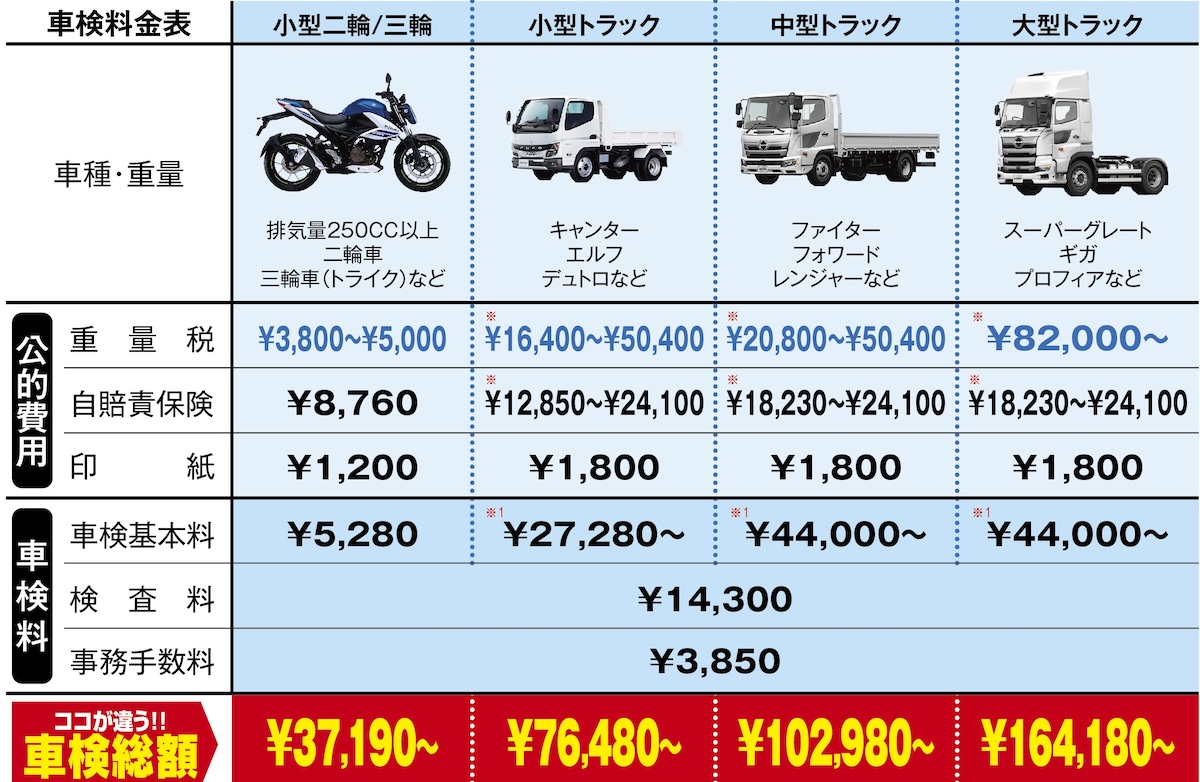 - 自賠責保険料は自家用登録、事業用登録や最大積載量により変わります。